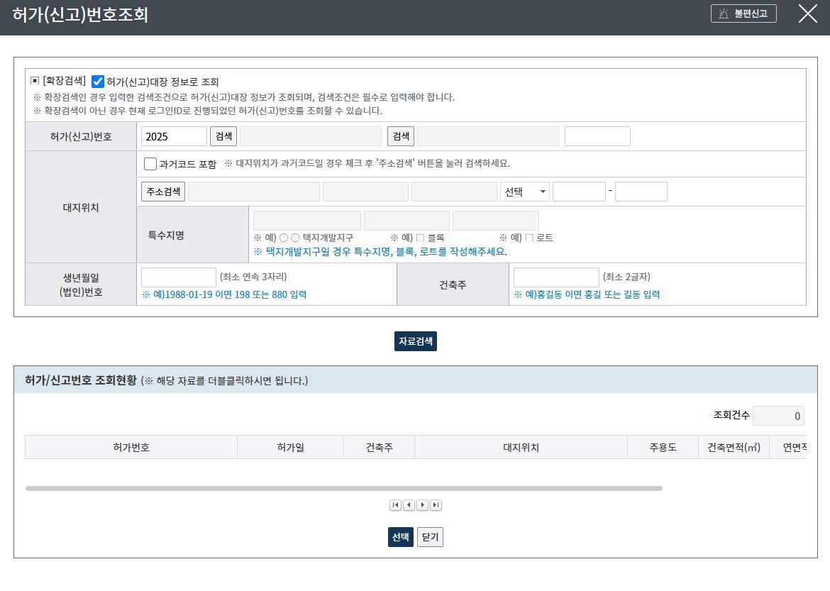 9. 건축구분 - 허가/신고사항변경을 선택하면 허가(신고)번호조회 창이 뜬다.