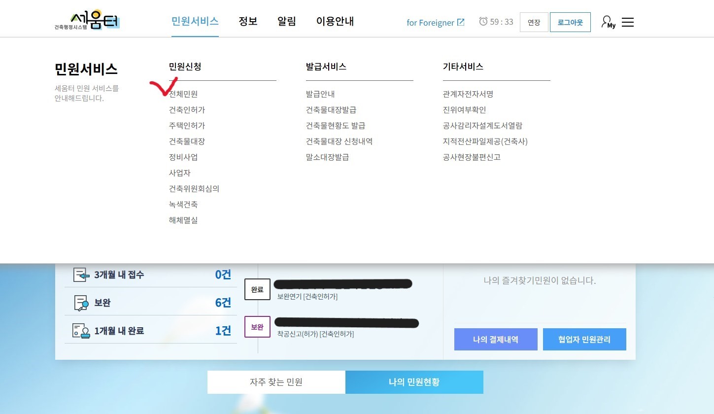 3. 민원서비스 - 민원신청 - 전체민원 클릭