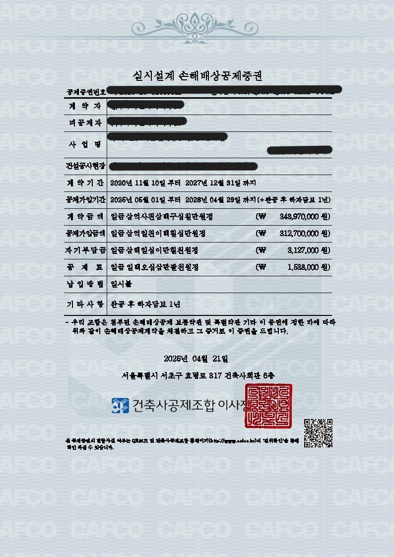 건축사공제조합에서는 설계와 감리가 각각 증권을 발급받고 SGI서울보증보험에서는 설계감리 같이 증권을 발급받습니다.