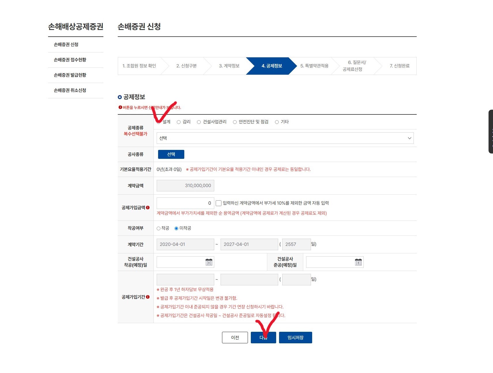 이때 건설공사 준공(예정)일이 계약기간보다 일찍 끝날 수 없습니다. 계약기간보다 뒤로 체크하여 주시기 바랍니다.